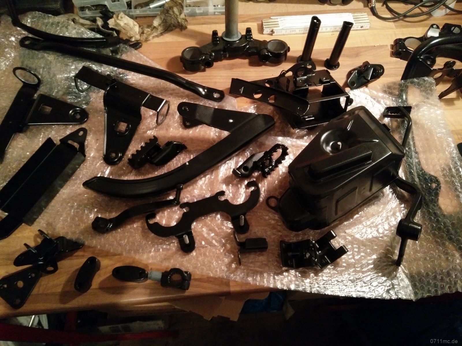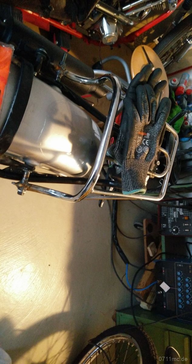 Der Pulverbeschichter war auch flott und hat wie gewohnt sauber gearbeitet (alle Gewinde und Passungen sind abgedeckt worden). So steht das Gerät an nur ein paar Abenden im Keller schon recht schnell auf eigenen Beinen. Soweit sind wir noch nah an der Serie, aber man kann es sich ja nicht verkneifen noch irgendwas besser machen zu wollen. Also 12V-Lichtmaschine rein tüddeln, USB-Dose und LED-Spots von freundlichen Chinesen anbauen und dann noch das Feature für die Erheiterung alles eisenharten Mitreisenden und Segen für meine zarten Bürohände: eine Griffheizung.