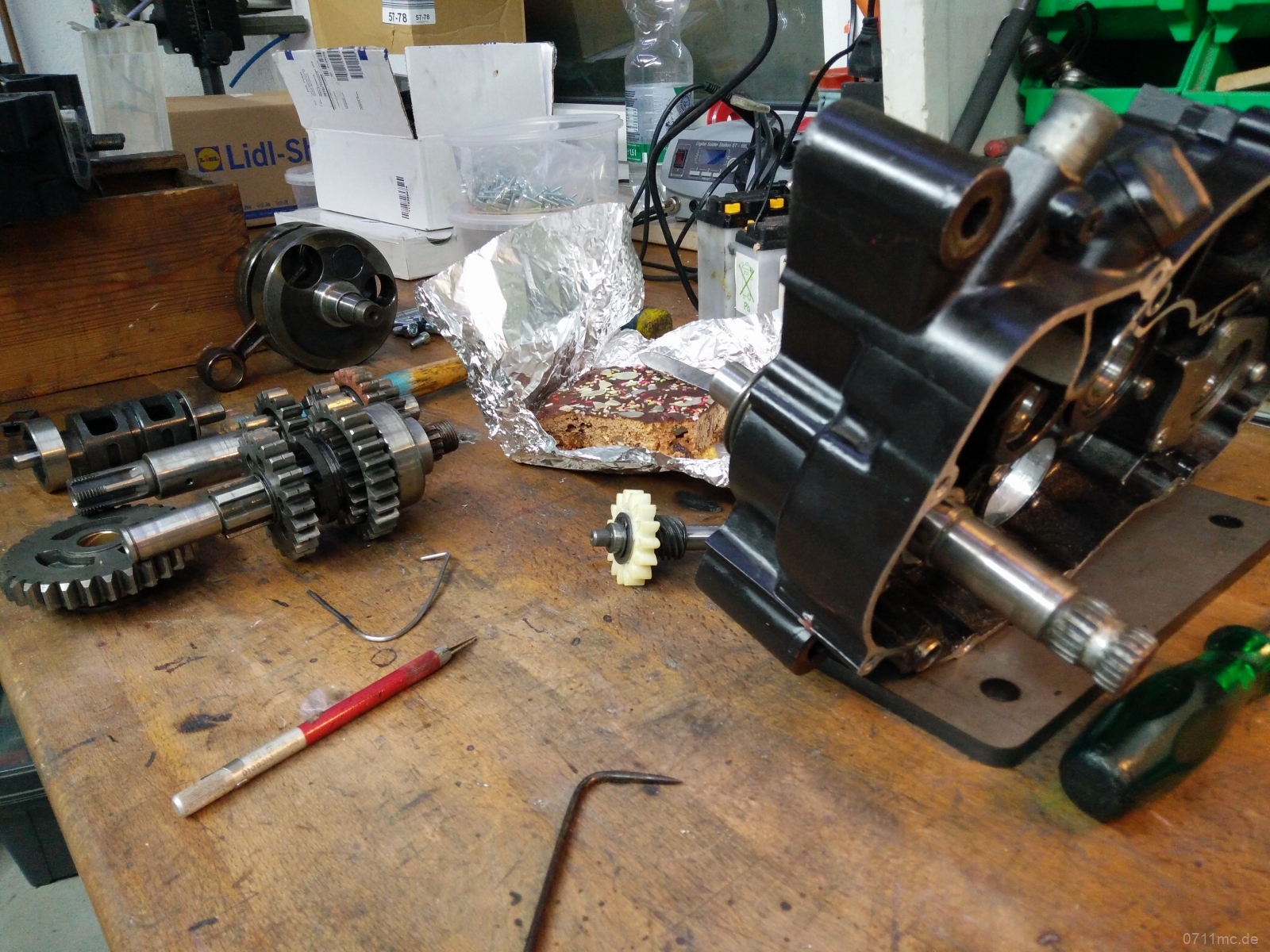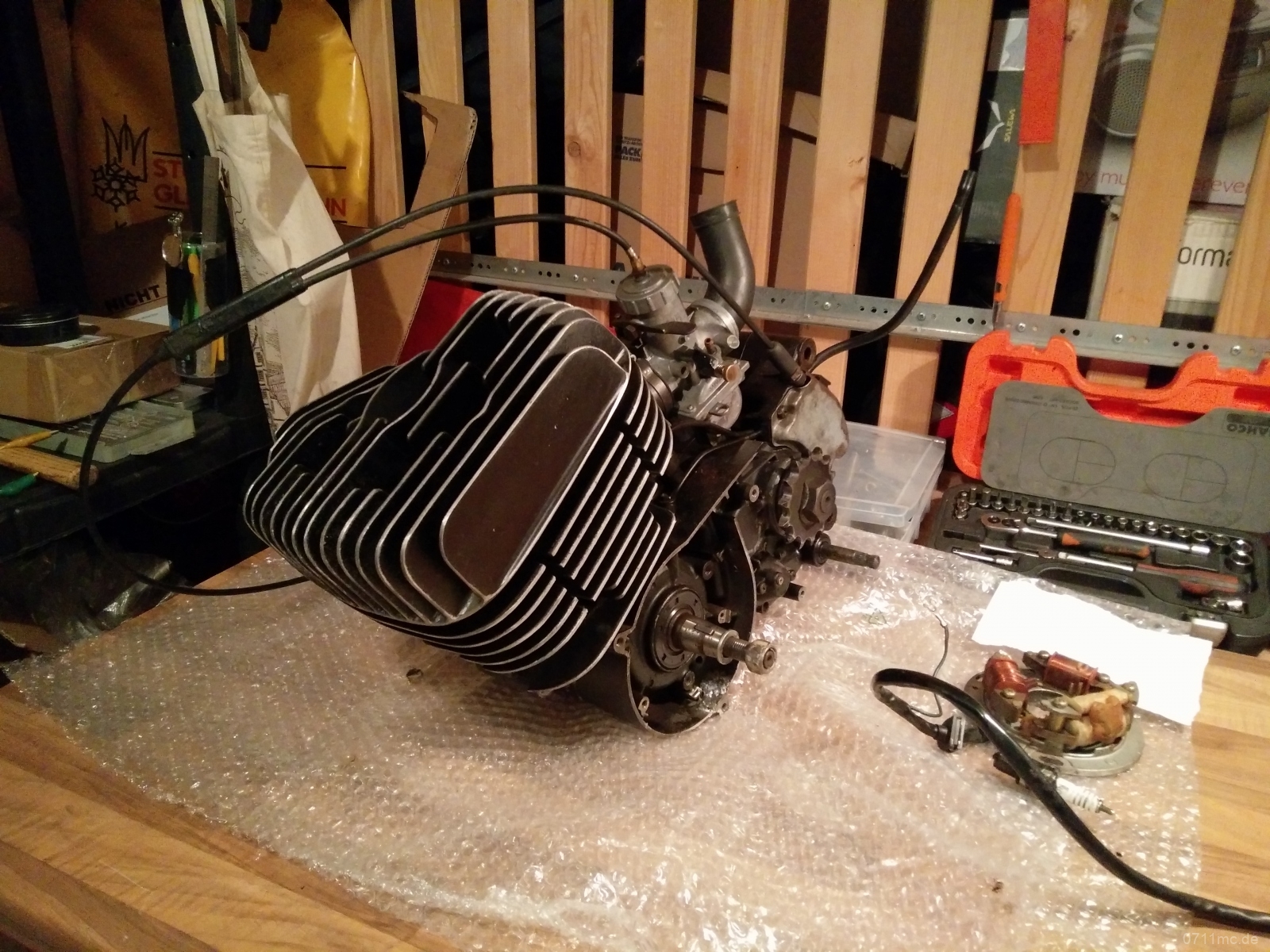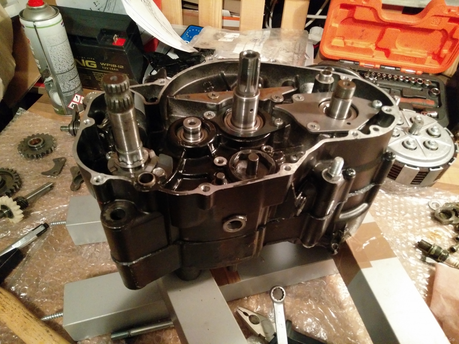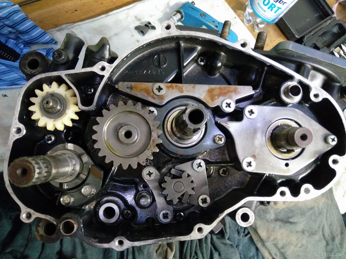 Während alles beim Beschichten war, ging es dem Motor an die Wäsche. In dem Motor fanden sich erstaunlich viel Dreck und ein bisschen Verschleiß. Nichts davon war besorgniserregend. Wenn eh schon alles offen da liegt kann man gleich die Kanäle nacharbeiten und sie von der Werksdrosselung befreien. Wieviel Leistung sie damit wohl haben mag?