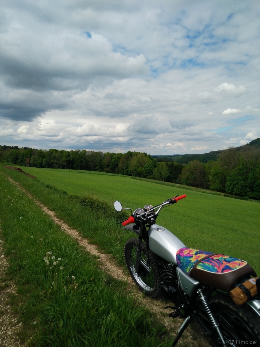 So ein Projekt endet natürlich nie. Nach der ersten Tour wurde offensichtlich, dass etwas mehr Gepäck mitgenommen werden muss, die verbauten Federbeine absolut nix taugen und der nicht mehr lieferbare Auspuff wie auch Scheinwerfer Schutz gegen umherfliegendes Geröll brauchen. Den originalen Gepäckträger gibt es nicht für Geld und gute Worte – weder hier noch in Japan. Die letzte Chance – Veterama Mannheim. Auch hier gab es ihn nicht, dafür ähnliche Rohrkonstrukte als Basis. Ein langer Nachmittag in der Garage macht aus dem Rohr einen passenden Gepäckträger. Durch YSS-Federbeine wurde das Fahren schon um Welten besser aber ist immer noch nicht ganz wie es sein sollte. Die nächsten Federbeine werden angepasst auf Fahrer, Gepäck (rund um den Bauchnabel wie auch auf dem Gepäckträger) und Fahrweise. Schutz für den Auspuff und Scheinwerfer bieten wieder tolle Teile vom freundlichen Chinesen.