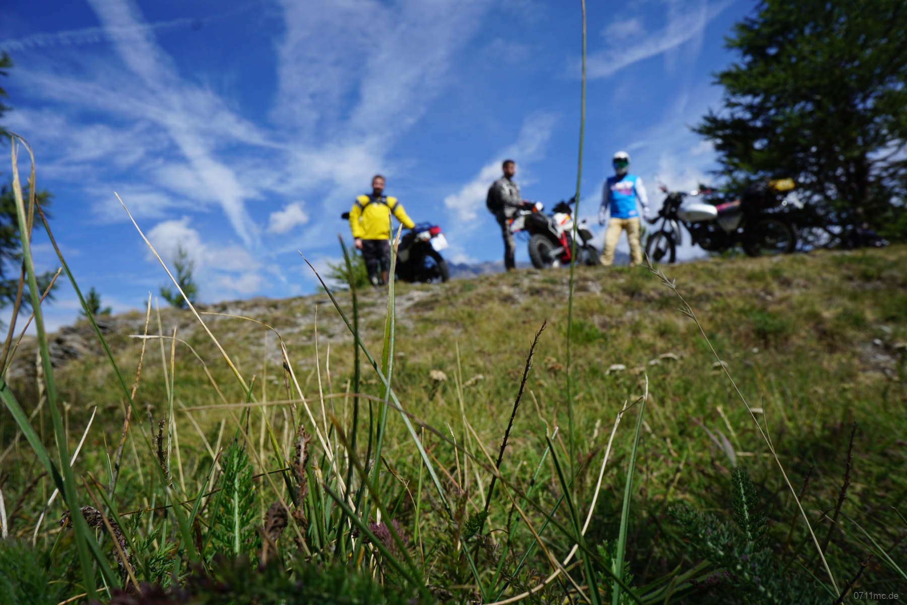Wir stehen wieder mit Sonnenaufgang auf, erwarten geduldig das Ende der Liebesbeziehung zwischen Sanitärbereich und Einzelnen und brechen in Richtung der berühmten Maira Stura Kammstrasse auf. Bis dahin rollen wir gemütlich auf meistens asphaltierten Wegen und erkunden dann die wahnsinnig tolle Landschaft rund um die Maira Stura. Während unserer Mittagspause dort oben stellen wir fest, dass wir doch schneller sein sollten, denn die vor uns liegende Route ist noch lang undwir brauchen dringend eine Abkürzung. Die Suche gestaltet sich langwierig, denn wir sind digital-only und der Empfang ist in der ganzen Region immer gut – außer heute. Wir entscheiden uns für einen hoffentlich durchgängig befahrbaren Weg in der zerklüfteten Landschaft. Er beginnt hinter einem für uns nicht bekannten Schild mit rotem Kreis auf weißem Grund und einer quer über den Weg gespannten Kette. Ab jetzt sind wir Fahrradfahrer und gleiten lautlos den Berg hinab bis wir eine kleine Bauernhütte erspähen. Wir erspähen leider auch menschliches Leben rund um die Hütte. Jetzt bloß nicht erwischen lassen. Der Deal ist militärisch formuliert: tarnen, anschleichen und zügig verschwinden. Zwei von drei schaffen es am Haus vorbei bevor Hund oder Mensch uns stoppen können. Einer von drei stürzt vorher und kann dann doch nur charmant winkend vorbei fahren.