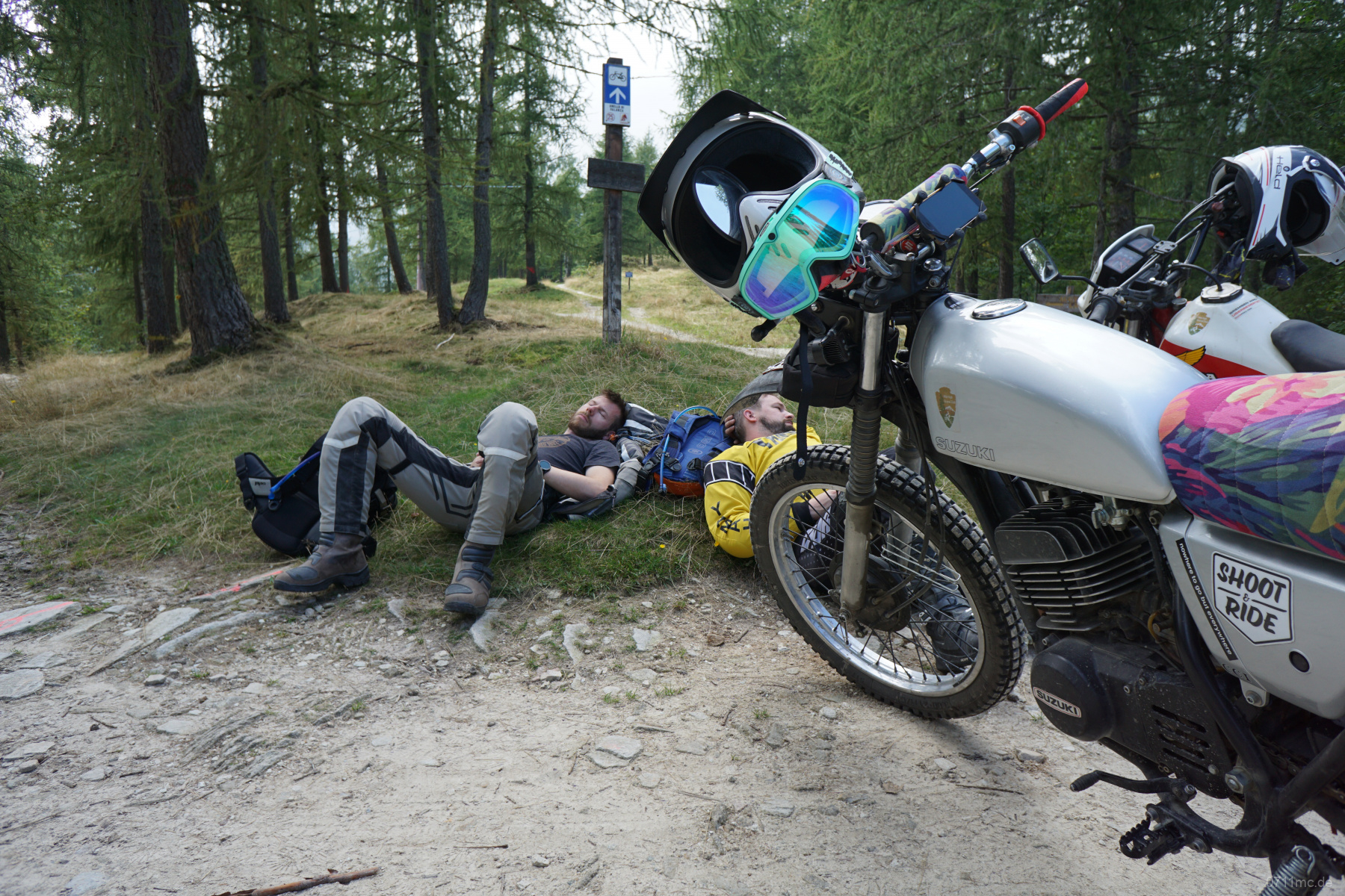 Los geht es bei sehr frischen morgendlichen Temperaturen nach Susa, tanken, über den Colle delle Finestre, dann entlang der Chisone, irgendwo rechts abbiegen und über Schotter über die Berge ins Pellice Tal. Auf den asphaltierten 5km findet sich kaum Zeit zum Verschnaufen bevor es wieder offroad über die Berge zum Po nach Pesana und zur dringend benötigten Tankstelle geht. So langsam werden die Beine weich, die Arme lang, der Horizont verschwimmt und die Fahrfehler häufen sich. Wir sind schon 6 Stunden unterwegs, die ersten sanitären Grenzerfahrungen wurden gemacht und die Äpfel und Müsliriegel aufgegessen. Das Wasser im Camelback schmeckt auch langsam schal, die ersten Befindlichkeiten der Gruppe werden lautstark geäußert und bei Pinkelpausen wird nach Hotels gegoogelt. Es ist klar: Wir brauchen Nahrung, Bier und wenigstens eine Idee wo wir übernachten können. Die nächstbeste Pizzeria ist unsere, der nächstbeste Supermercado verkauft uns Bier und die Recherche hat ergeben: nur noch ein Bergkamm bis zum Campingplatz. Also alles easy, ein letztes Mal den Helm aufsetzen und los.