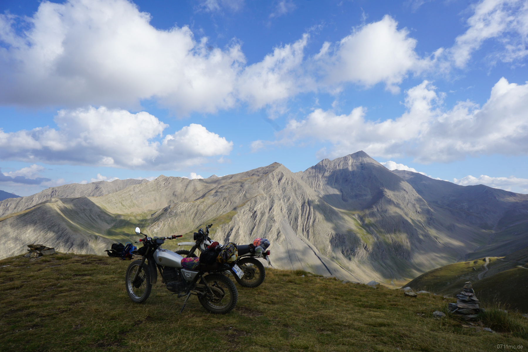 Die Gegend rund um den Stausee mit seiner befahrbaren Staumauer und beeindruckender blauer Färbung wird unser Spielplatz für den ersten Tag. Wir beschäftigen uns mit Luftdruck prüfen, Gepäck verzurren, am Vergaser fummeln und sich wieder an die dicken Stiefel gewöhnen. Am Vergaser fummelt man selbstredend erst sobald auf 2600m Höhe noch ungefähr 0,78 der ursprünglichen 20 PS vorhanden sind und der Vortrieb ein jähes Ende nimmt. Welche Düse war nochmal drin? Hatte ich die nicht schon getauscht? Wo liegt die passende Hauptdüse? Liegt die jetzt wirklich im Auto? Machen wir das eigentlich gerad ezum ersten Mal? Das Fitnessprogramm findet dann halt neben dem Motorrad laufend statt, aber die Aussicht über den See und die angrenzenden Gipfel entlohnt dafür.