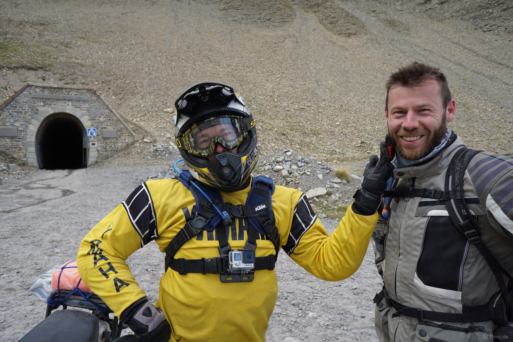 Wir erreichen das Tal ohne weiteren Feindkontakt, beschließen aber trotzdem das zügige Verlassen des italienischen Staatsgebiets. Währenddessen stellt sich eine ausgeprägte Leere in den Tanks ein. Ab dem Colle della Maddalena sind wir wieder lautlos unterwegs, führen lange Autokolonnen an und schaffen erstaunliche 30% mehr Reichweite als üblich bis zur Tankstelle in Jausiers. Der Nachmittag ist schon deutlich angebrochen und wir sind immernoch weit weg von zuhause. Wir peilen den Col du Parpaillon an und erreichen den berühmten Tunnel am späten Nachmittag bei wunderbarem Licht und mutterseelenallein. Wir sind bei jeder Pinkelpause begeistert vom Ausblick, dem Fehlen jeglicher anderer Menschen und dass es wirklich erlaubt ist hier mit dem Motorrad zu fahren. Ab geht es in die Dunkelheit des Tunnels – doch trotz der chinesischen LED-Spots bleibt der Bodenbelag unsichtbar und die Tiefe der Pfützen unklar. Das Panorama bei der Ausfahrt am Nordportal erschlägt uns. Wir saugen die Eindrücke kurz ein und begeben uns auf die Abfahrt Richtung des Flusses Durance. Nach wenigen Kilometern werden wir gestoppt. Rinder stehen auf dem Weg und machen keine Anstalten sich zu bewegen. Und die Rinder haben Hörner und Eier. Uns Stadtmenschen kommt das alles nicht richtig schlau vor, aber wir müssen vorbei fahren. Bis wir endlich an der Durance ankommen, ist es früher Abend und wir tauschen den letzten geplanten Offroad-Ausflug durch die Skigebiete gegen einen Rest Tageslicht auf dem Heimweg und fahren die zwei Stunden auf der Straße nach Hause. Es wird dunkel und empfindlich kalt in den höheren Lagen. Beim letzten Tankstopp wird beschlossen, dass am kommenden Tag die Krümmer kalt bleiben werden.